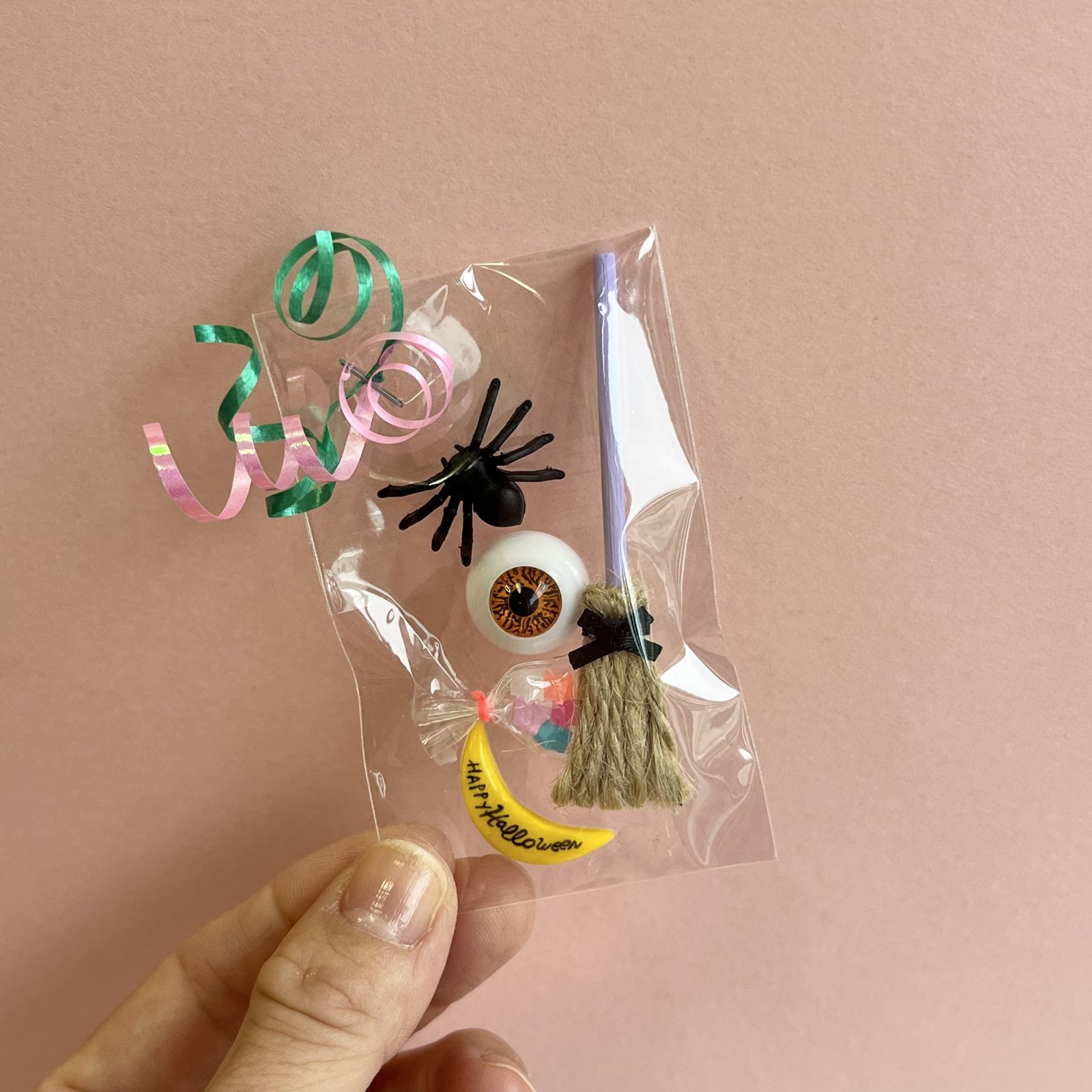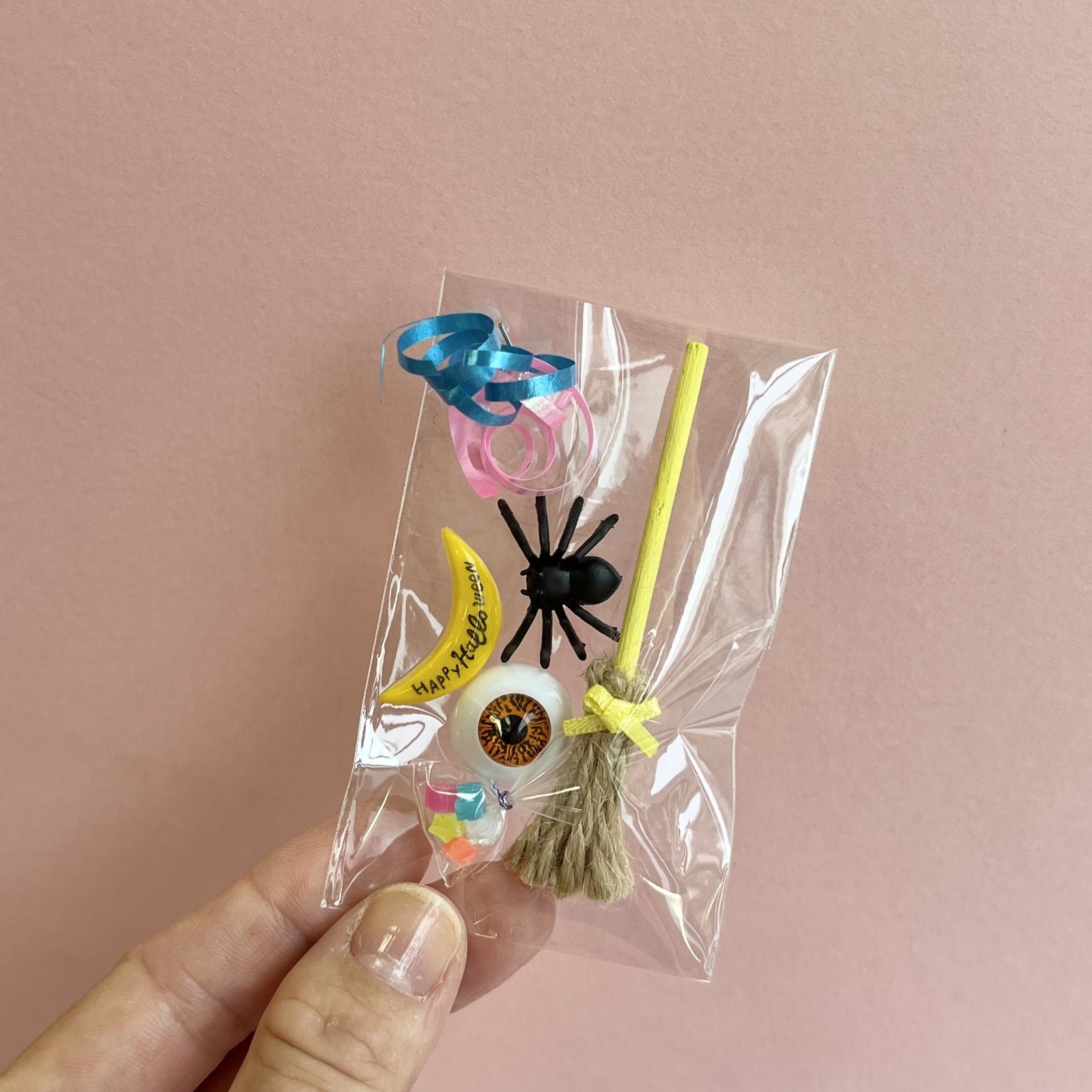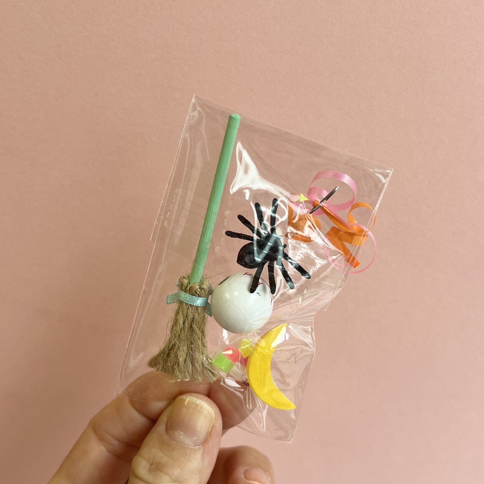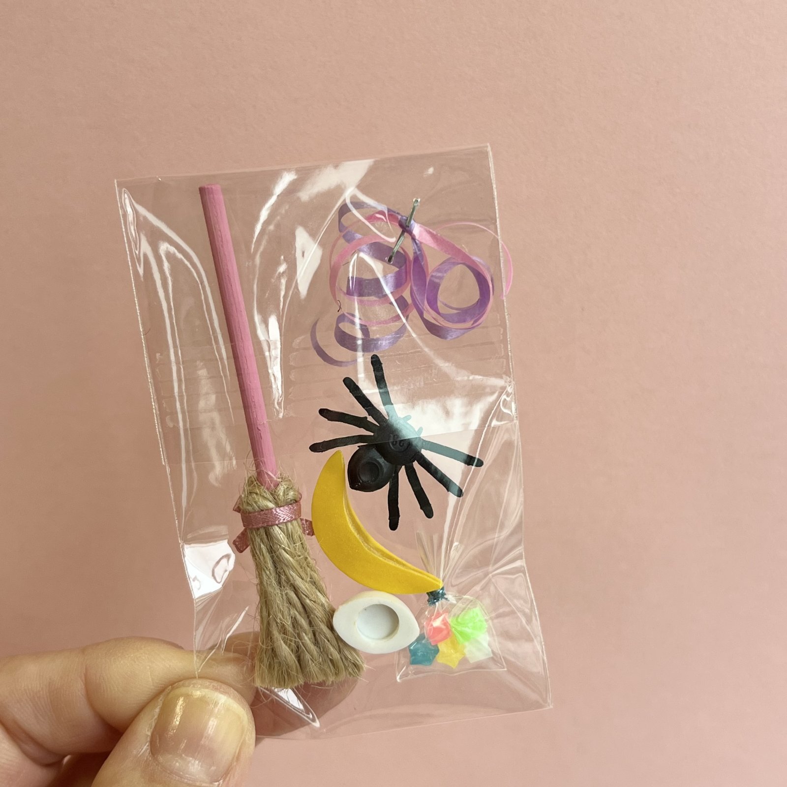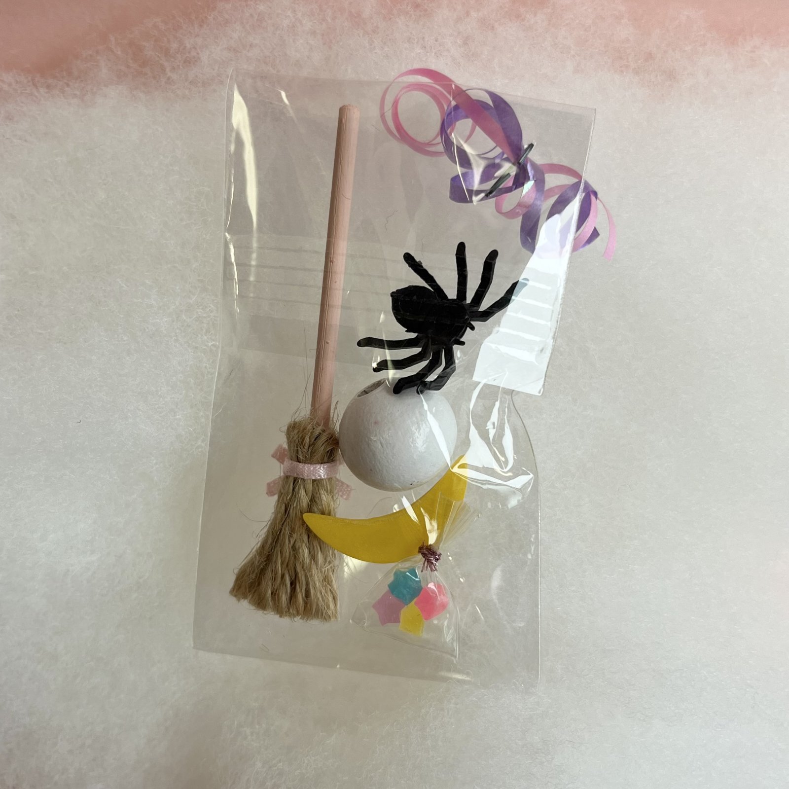 ミニほうき、お月様、くも、目玉、お菓子の5点SETです。